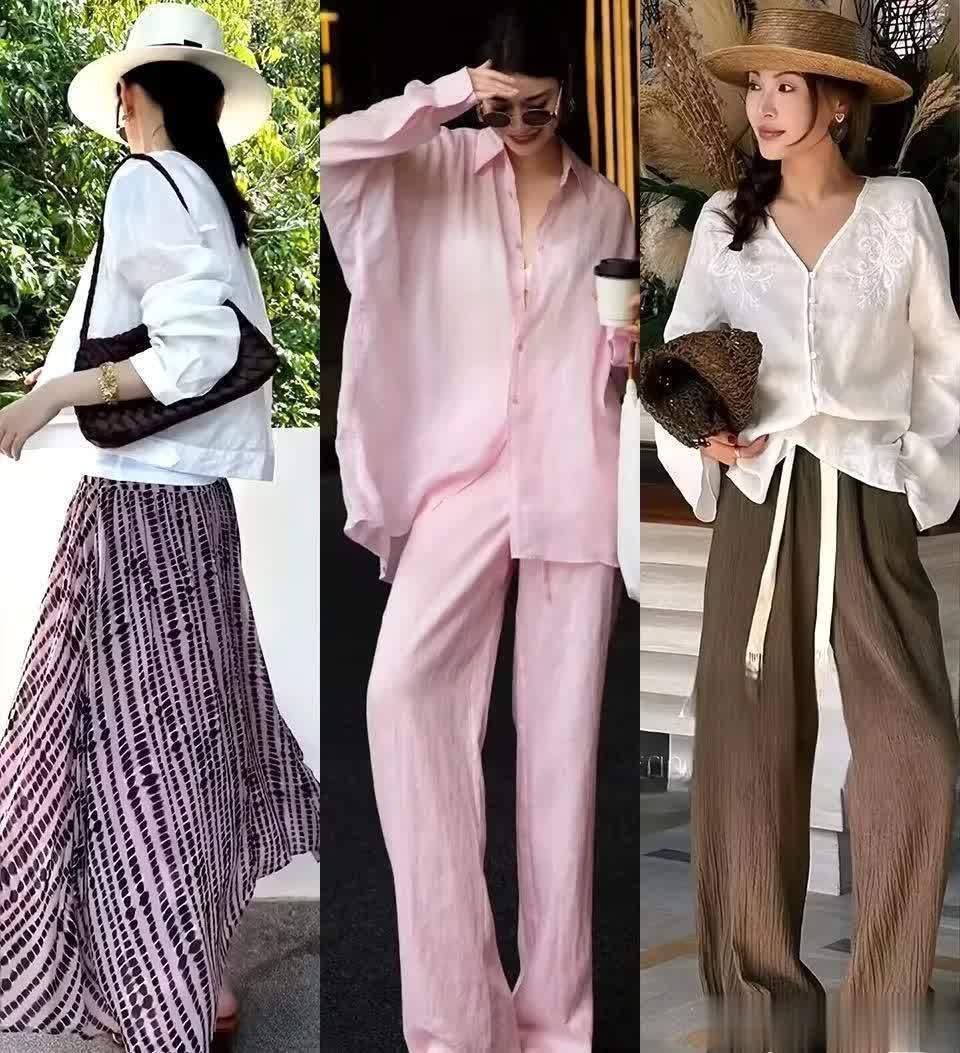樱花粉色的亚麻衬衫,自然的材质加上小清新的粉色更显得轻盈慵懒,搭配同色系的阔腿裤,单一配色更觉得高级。