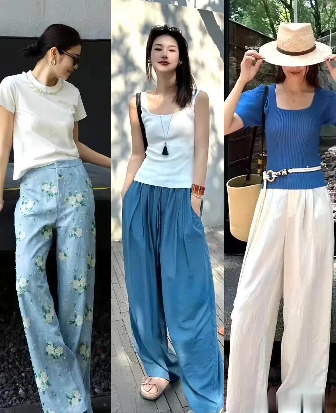 白色背心搭配克莱因蓝色的阔腿裤,配色非常的干净,很有轻氧感。