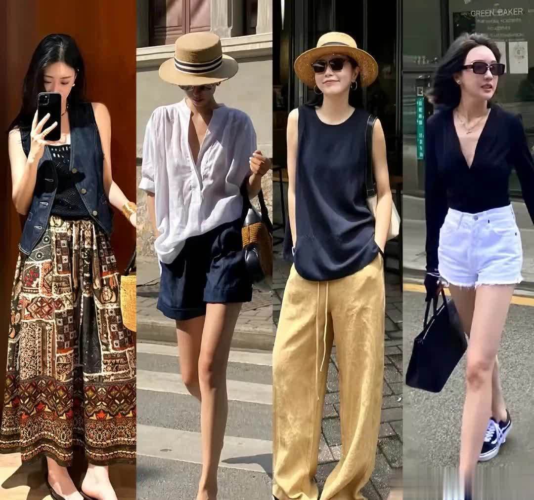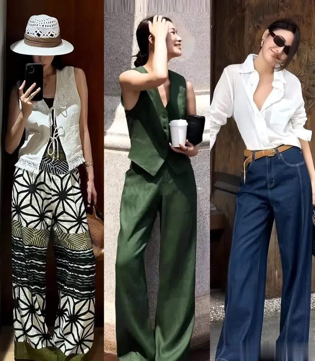 墨绿色的马甲搭配同色系阔腿裤,深绿的颜色看起来更复古高级,适合成熟一些的女生,适当露肤更显得清凉自在,轻松穿出轻氧感。