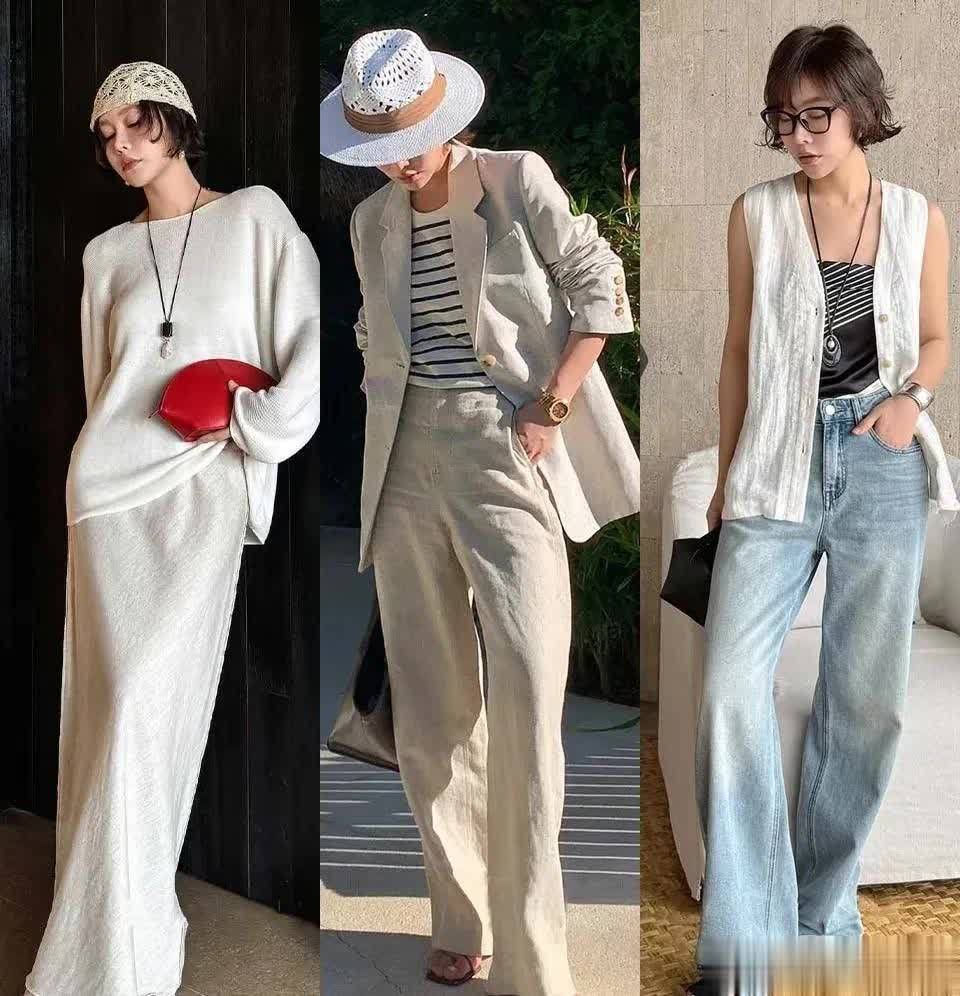 浅灰色的亚麻西装,搭配同色系同材质的阔腿裤,有种老钱风的贵气,不张扬却显得特别有质感,适合夏日通勤。