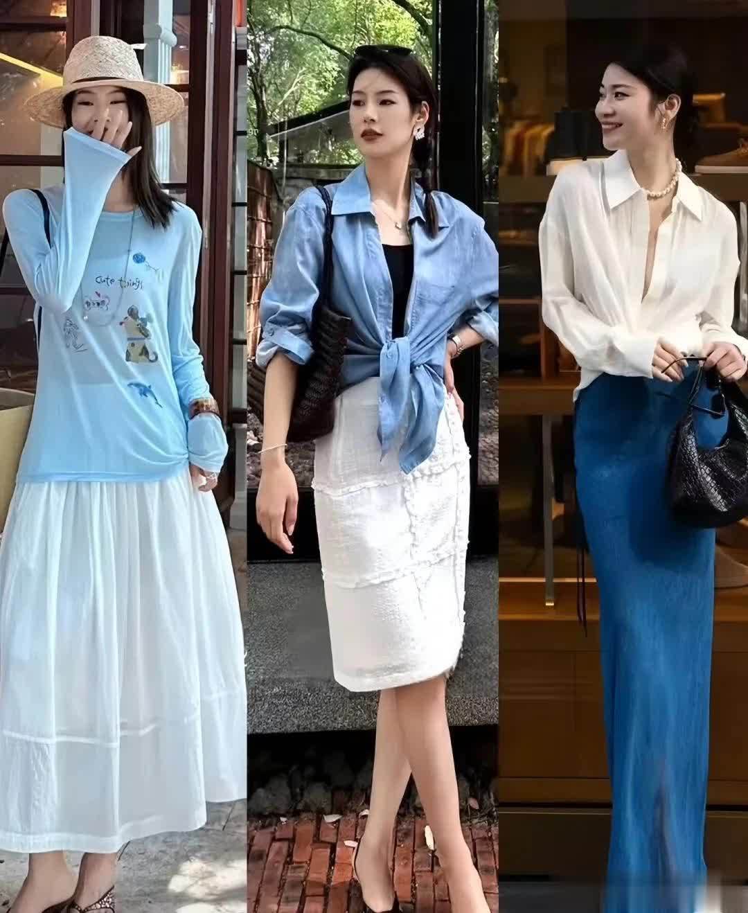 日常生活中,可以挑一件水蓝色的T恤衫,宽松一些更慵懒,搭配白色的长裙,清淡的配色温柔不刺眼,自带舒缓氛围,很适合夏天。