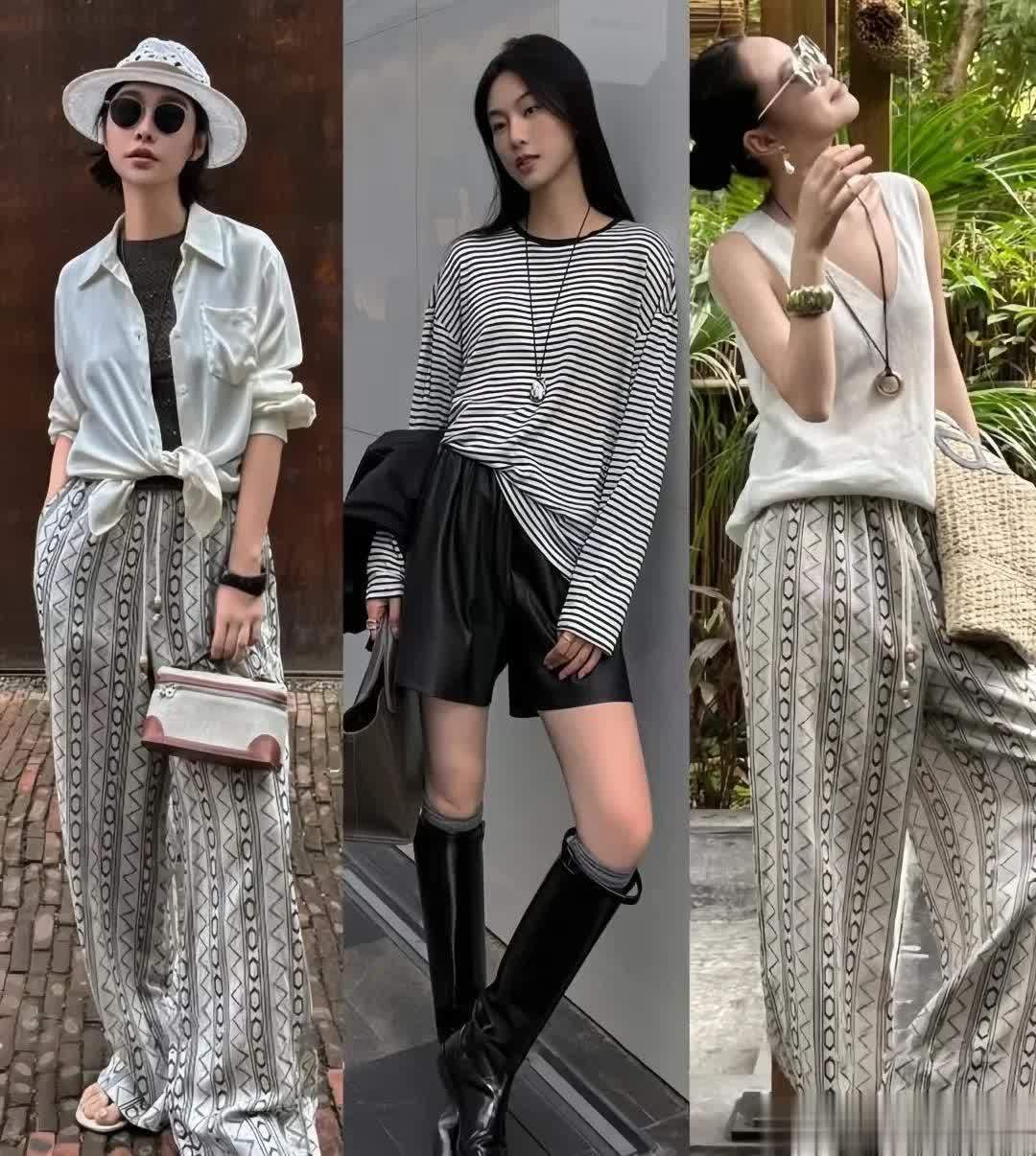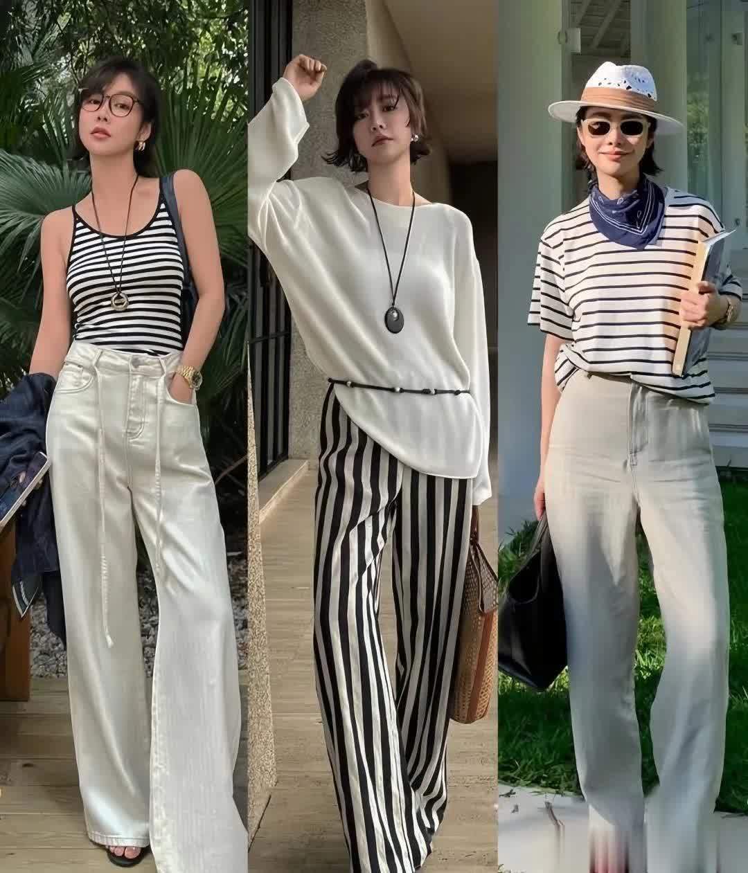 黑白条纹针织衫,简洁干净,搭配浅灰色的阔腿裤,配色更为清爽简洁,营造出夏日优雅知性的氛围,很显气质。
