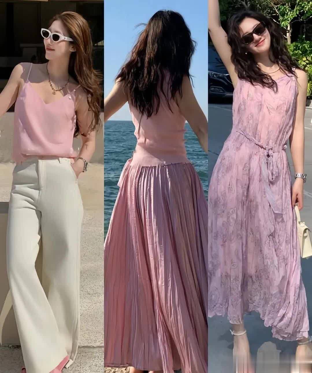 肤色白皙的女生,可以选择一件浅樱花粉色的吊带,更显白好看,搭配白色的阔腿裤,配色清新可爱,减龄效果非常好。