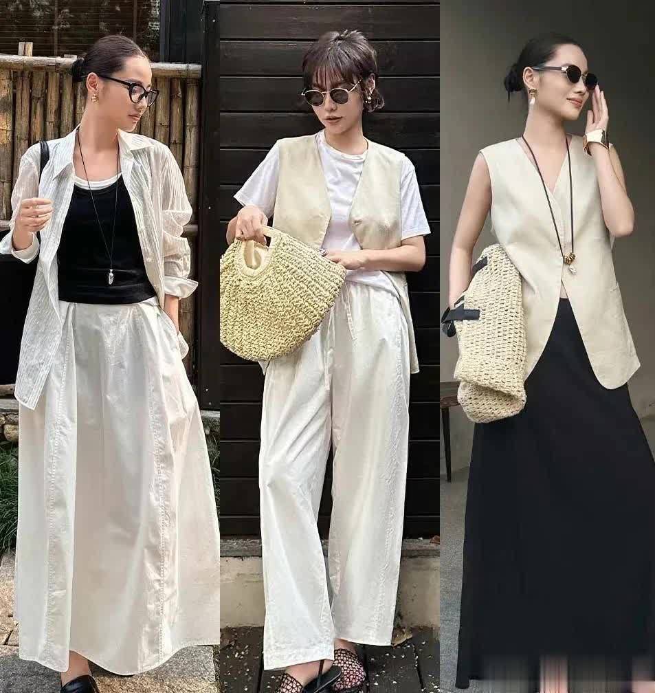 白色亚麻衬衫,叠穿黑色吊带,经典的黑白配色简洁高级,配上白色的长裙,又增加以清新飘逸的腔调。